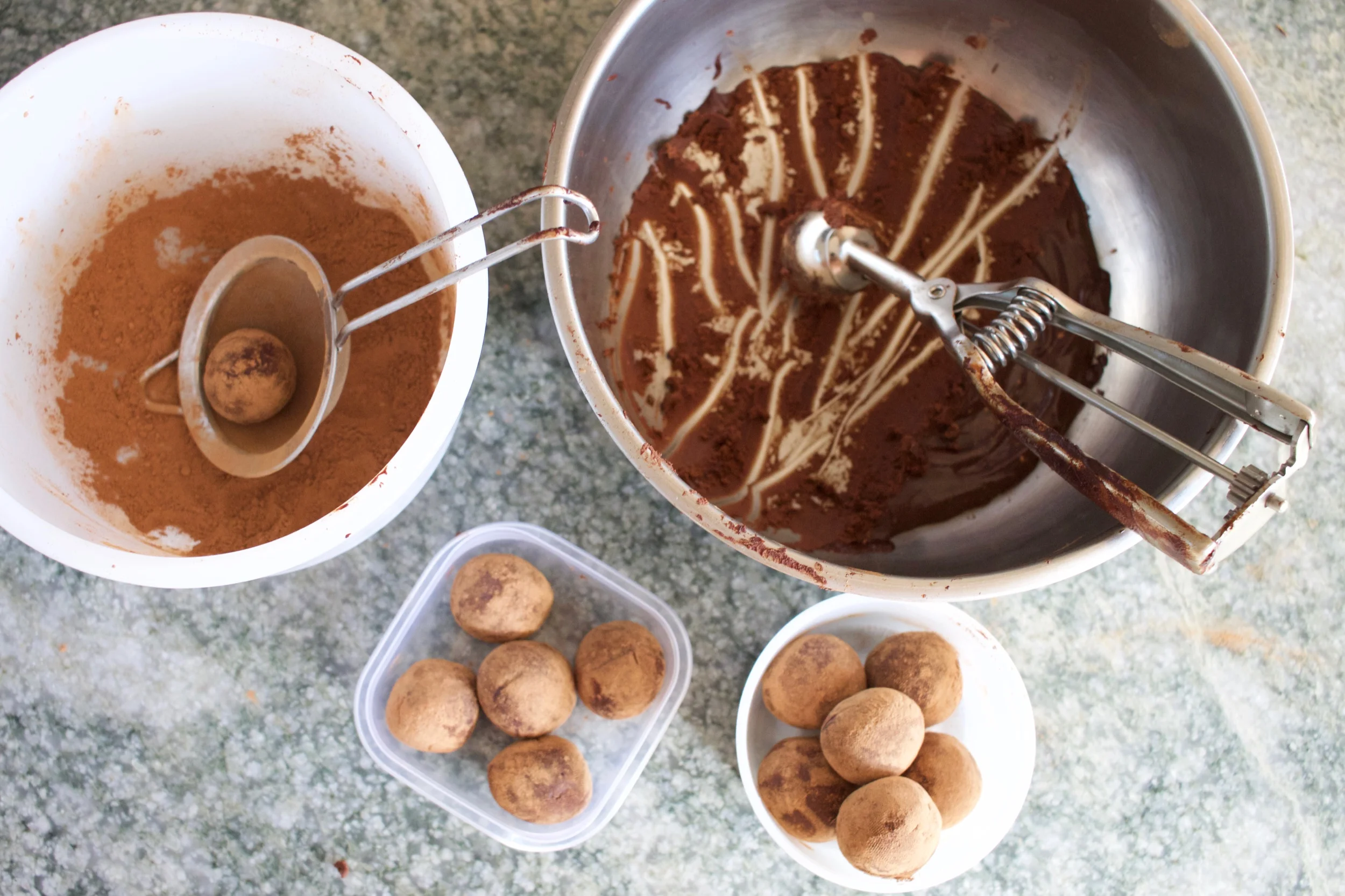 Pour the mixture out into a wide and shallow bowl and place it in the fridge for about 20 - 30 minutes. The mixture should be firmed up enough to scoop it out. Scoop out some mixture with a spoon or the ice cream scoop, then use your hands to roll each portion into a ball. Once it’s round, roll each one in cacao powder, shaking off any excess by shaking the ball around in a small mesh strainer.